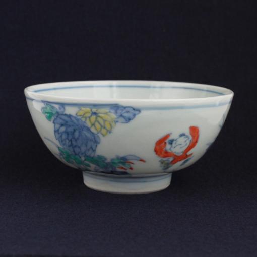 染付で描かれた上に、赤・黄・紫・緑で色を挿した豆彩手。